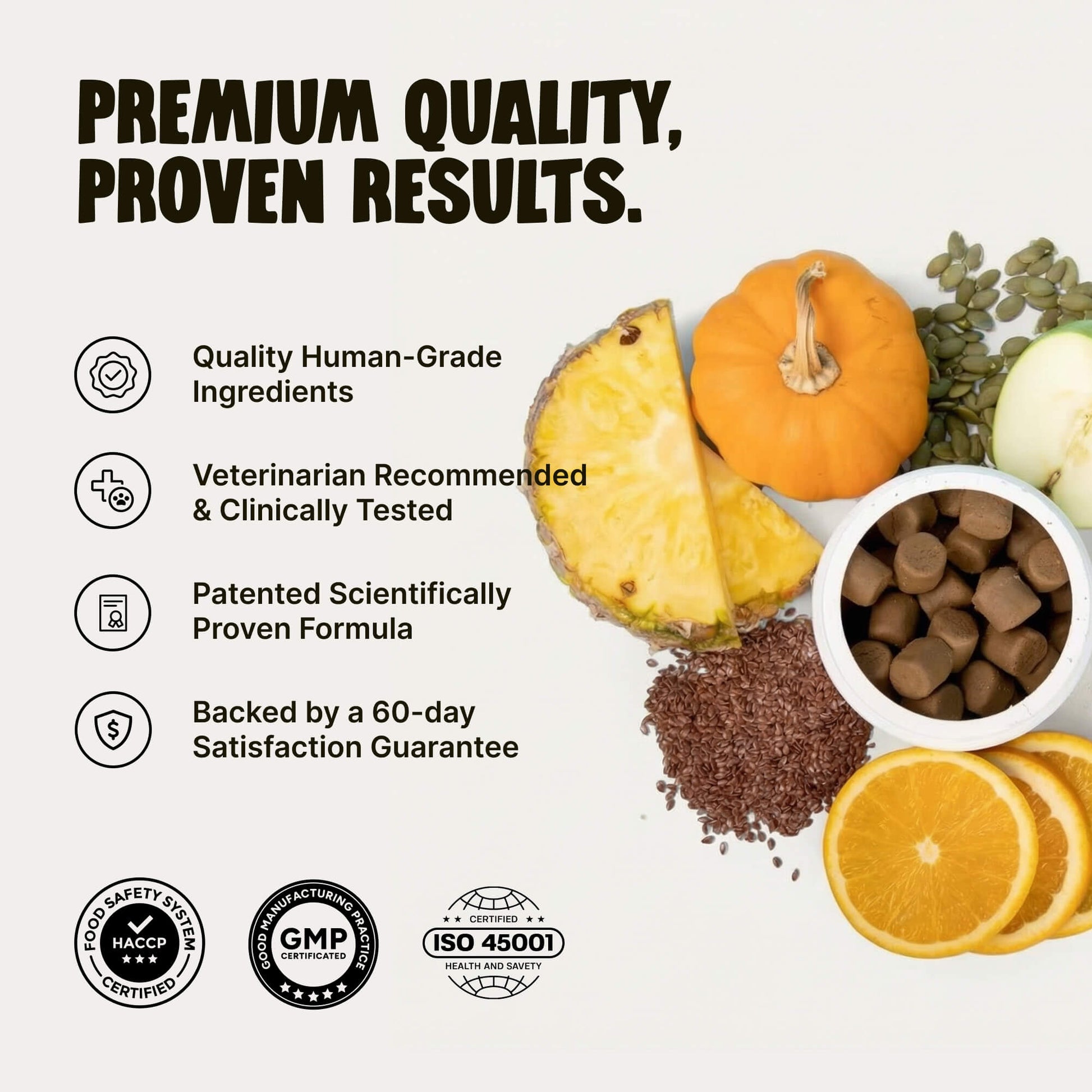 Our Chews break the cycle of discomfort by doing what plain food can’t: creating the perfect stool consistency required for the glands to empty naturally every time your dog goes. Unlike basic fiber, our triple-action blend soothes inflammation and balances gut health to stop issues before they start.
