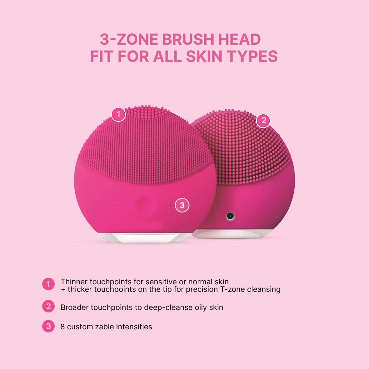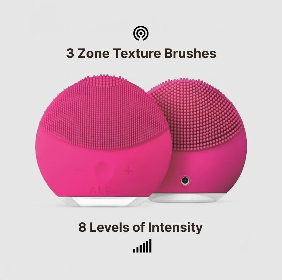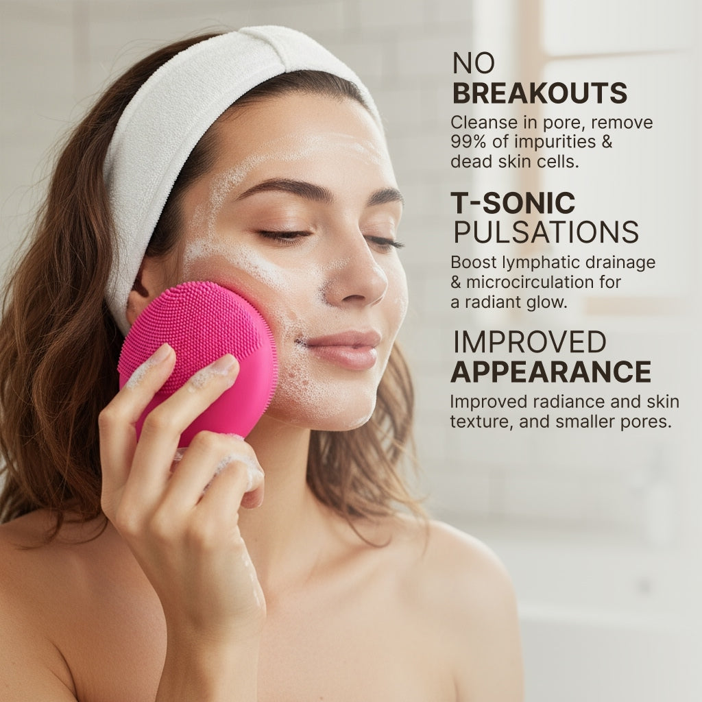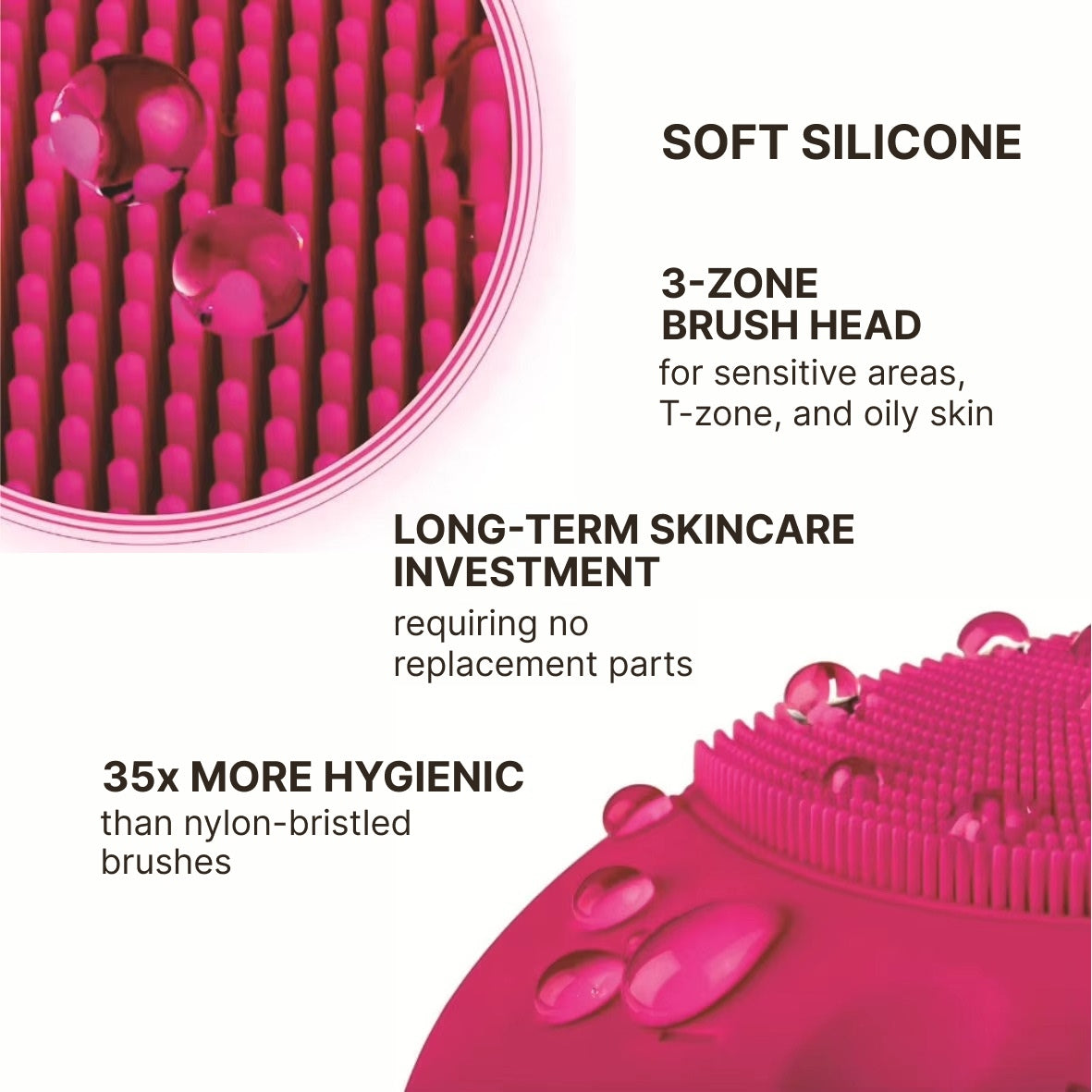 Powered by gentle sonic pulsations and ultra-hygienic silicone, this device removes up to 99% of dirt, oil, and makeup residue, without harsh bristles.